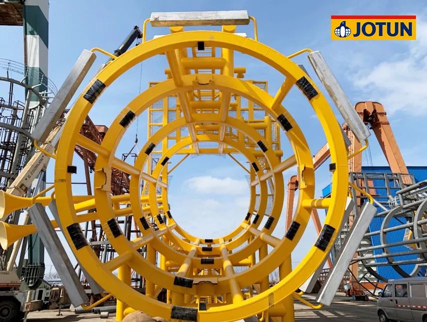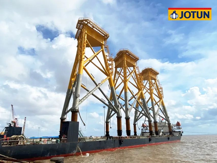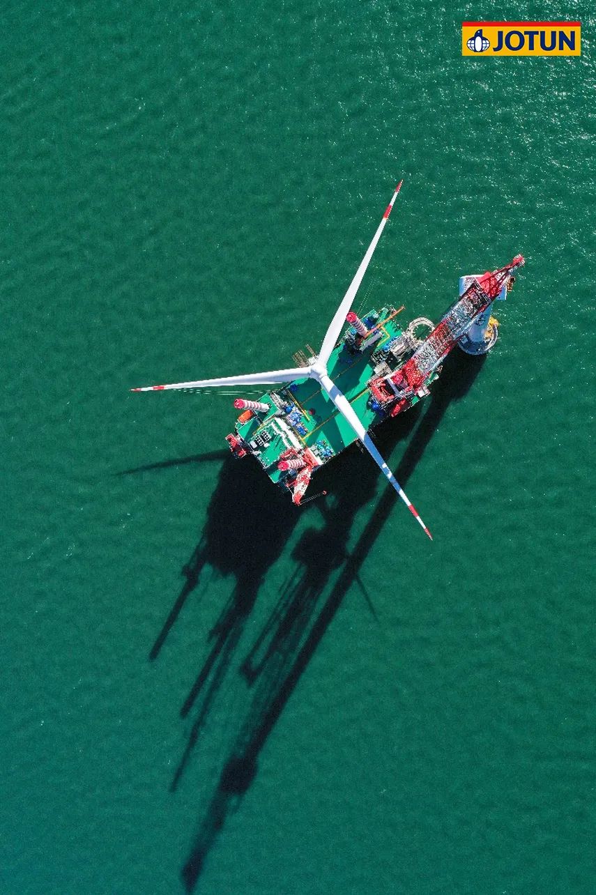 項目總投資102.86億元,規劃容量500兆瓦,水深范圍41-46米,離岸距離55公里。67臺海上風機矗立在水深40多米的海里,風機基礎結構采用導管架形式,佐敦為整個項目的導管架涂裝提供了超過700,000升防腐涂料。